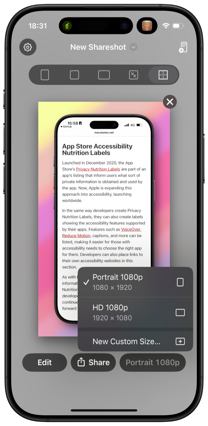 Note: This change required making new App Intents sadly, due to limitations of Appleโ€™s AppIntents framework. The old intents will continue to work but to use the new custom sizes or output adjustments youโ€™ll need to migrate your shortcuts over to the new intents.