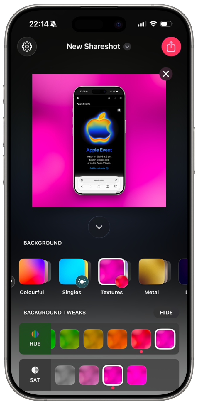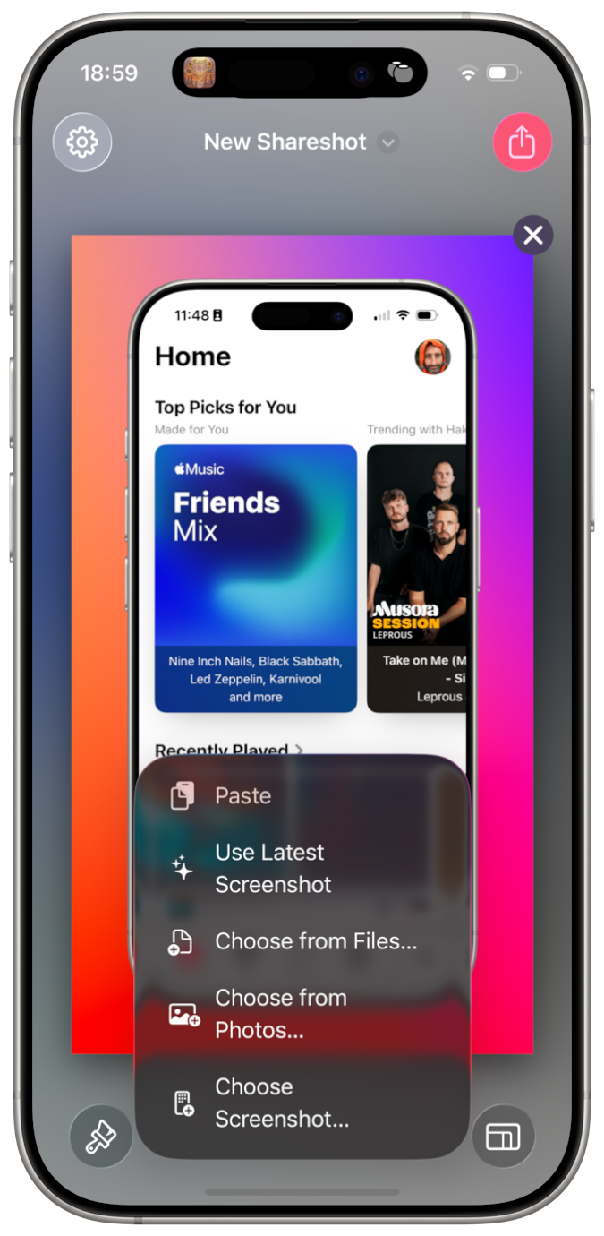 In addition to adding support for Liquid Glass, we moved some things around in the main user interface. Our users love how quickly Shareshot gets you from image to output, so we put key functions into consistent prime locations on the screen. As part of this priority shift and preparing for features we’re already working on for the next big release, we also made more space to work with your images.